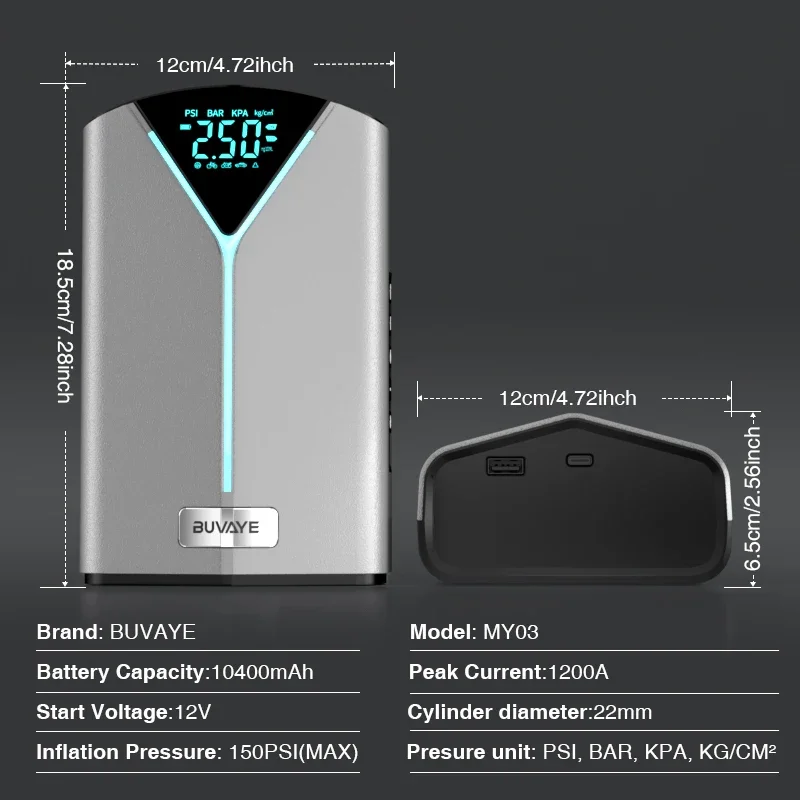 BUVAYE Portable 4 in 1 Car Battery Jump Starter Air Pump Power Bank