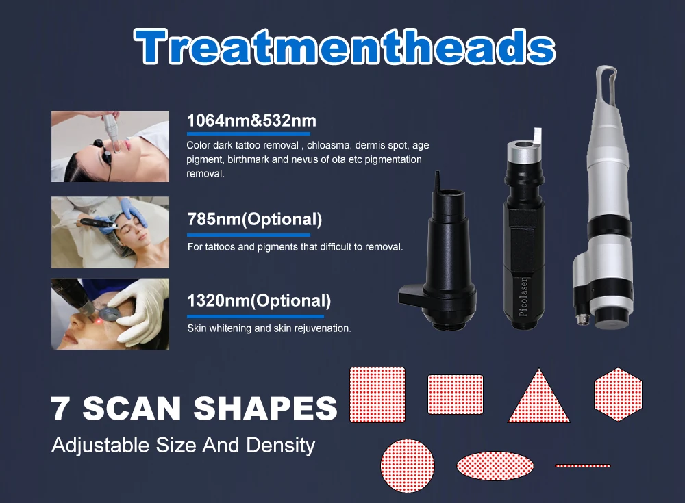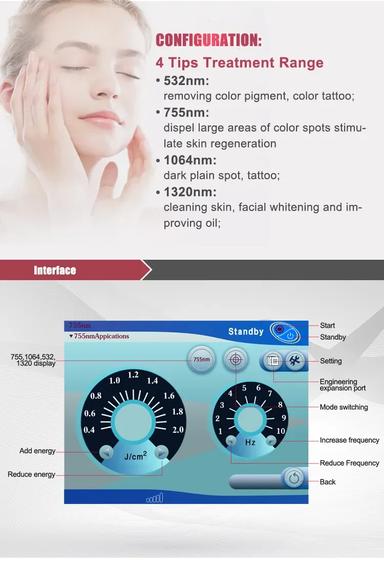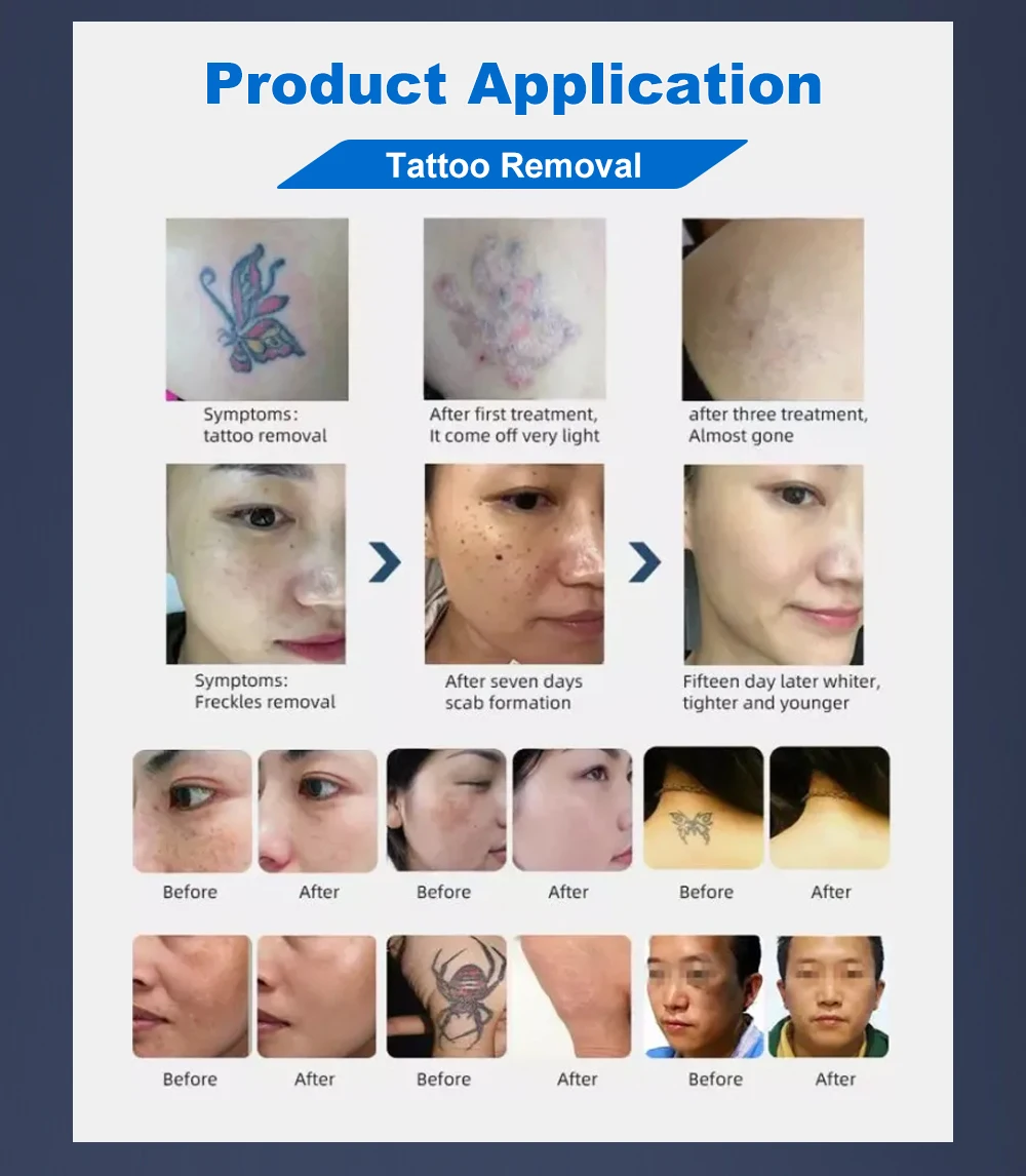 1064nm: 1-10 adjustable spot, effectively eliminate dark tattoos, tattoo eyebrows, lips, eyeliner and traumatic pigmentation and freckles.